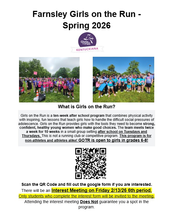 \It’s almost time for the Girls on the Run spring 2026 season! Girls on the Run is a girl empowerment program that combines physical activity with fun and inspiring lessons. Students, check out the fliers posted around the school or take a flier located outside the Youth Service Center’s (Mrs. Roberts) door.