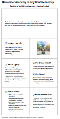 February 17 - Family Conference Day, 11 am to 5 pm