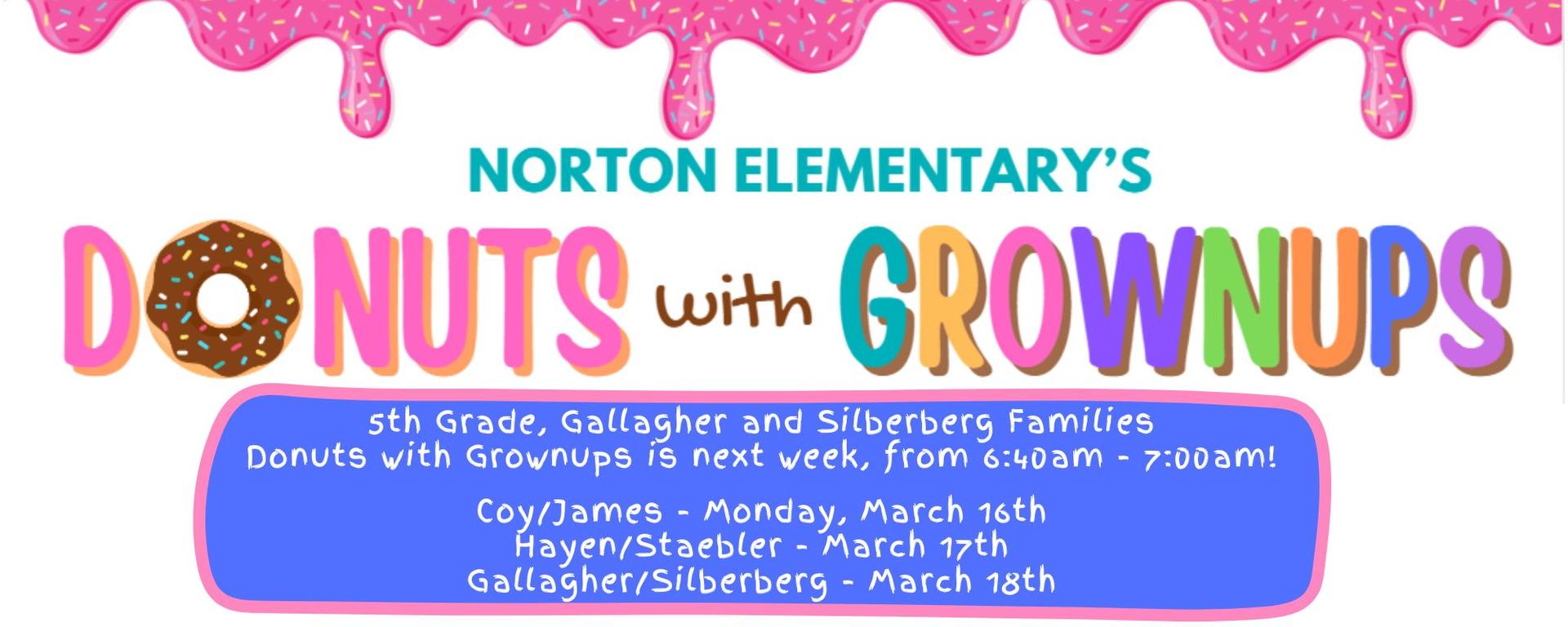 5th GRADE, GALLAGHER, AND SILBERBERG FAMILIES | Join us next week for Donuts with Grownups, March 16th - 18th from 6:40 am - 7:00 am. Each student may invite one or two special grown-ups to join them on their assigned class date. Coy and James - March 16th, Hayen and Staebler - March 17th, and Gallagher and Silberberg - March 18th. No need to register - we're excited to see everyone.