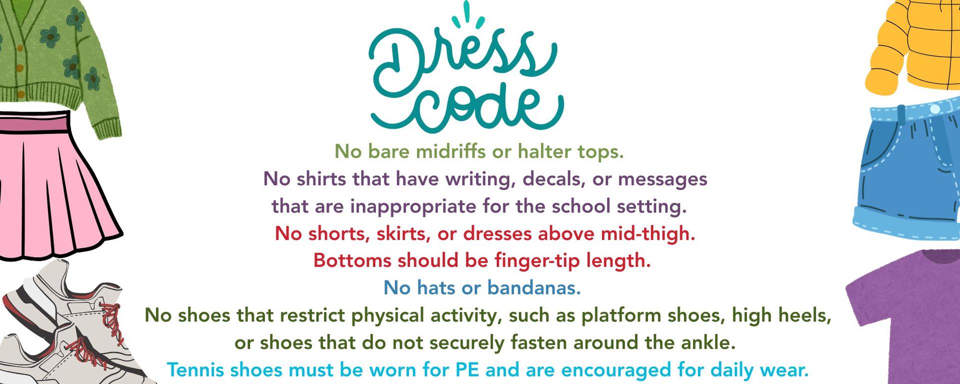 Clothing should fully cover the midriff. Halter tops and similar styles are not permitted. 🚫 Respectful Messaging Attire must be free of inappropriate language, graphics, or symbols. 👗 Length Requirements Shorts, skirts, and dresses should extend at least to fingertip length when arms are relaxed at the sides. 👟 Footwear