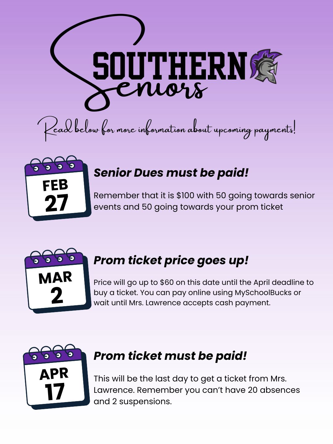 See the flyer for more information about senior dues and the prom. Use the links below to make payments. Cash payments for dues can be given in person to Ms. Page in the counseling office. Mrs. Lawrence will make an announcement later in the semester about cash payments for prom tickets.