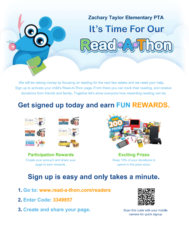 This runs through December 16. As your child logs their reading, the minutes will be added to their class account. As the class total minutes grow, the class will earn rewards. You will also be able to share the link with your friends and family in case they want to donate to the ZT PTA.