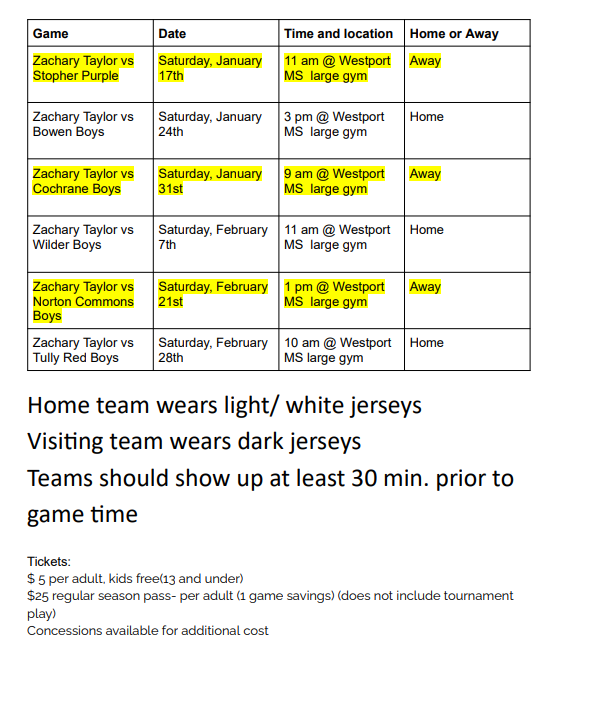 Our basketball team has started practicing and I know they would appreciate some fans. Mark the dates on your calendar. All games are at Westport Middle School. |