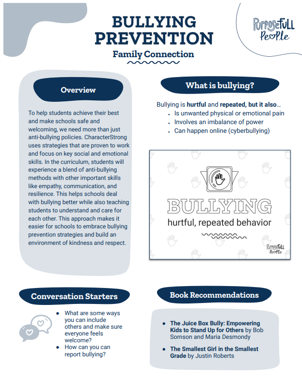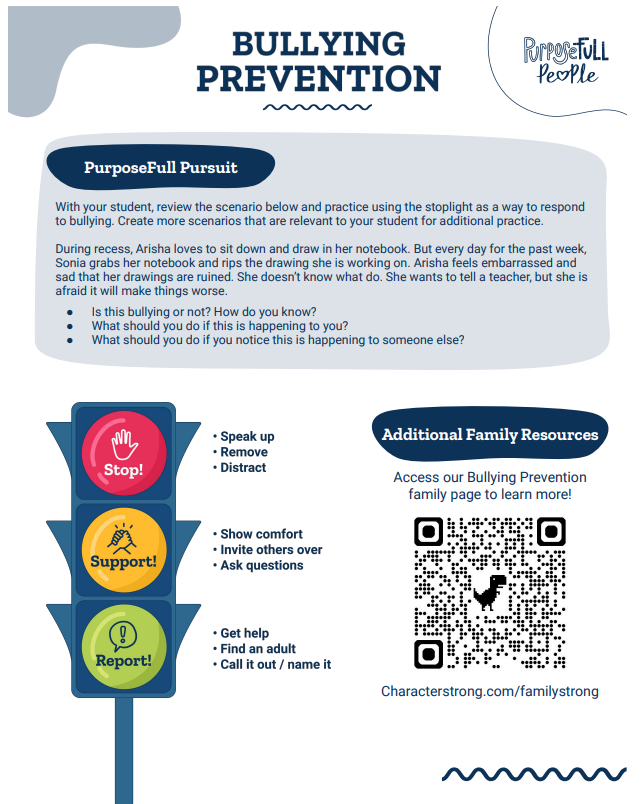 Finally, we focus on Bully Prevention strategies all year. Please see the information below on how you can support your child in this area.